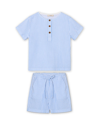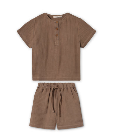 Sødt sæt bestående af bløde, vævede shorts og skjorte i let muslin-bomuld. Shortsene har elastik i taljen og praktiske sidelommer, og de går til mi...