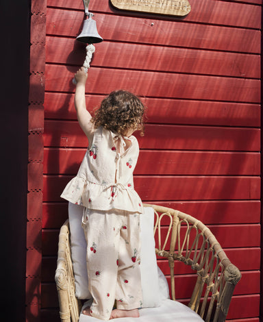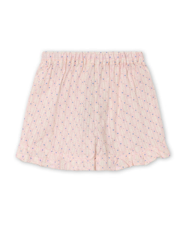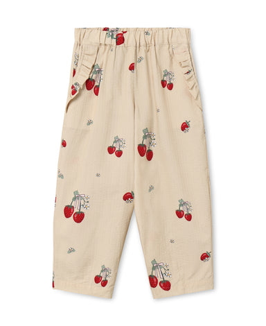 Let og blød buks i seersucker-kvalitet med sommerligt jordbærprint. Bukserne har elastik i taljen og små flæsedetaljer på sidelommerne, hvilket giv...