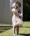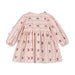 Kjolen har lange ærmer og en skæring i taljen, som skaber ekstra vidde i skørtet og giver god bevægelsesfrihed. Den runde hals og de stofbetrukne knapper i ryggen gør kjolen nem at tage af og på, mens små sløjfedetaljer på brystet tilfører et fint, feminint touch.