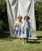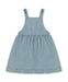 Klassisk denim spencer-kjole i 100% bomuld med smukke detaljer. Kjolen har et taljesnit med små folder, der giver volumen og bevægelsesfrihed. Sidepockets er dekoreret med fine broderede sommerjordbær, og nederst afsluttes kjolen med en sød flæse. Lukningen sker med klassisk spænde foran, hvilket gør den enkel at tage af og på.