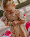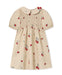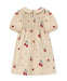 Let og blød kjole i seersucker-kvalitet med sommerligt jordbærprint. Kjolen har rund hals, korte flæseærmer og en løs pasform, der giver volumen og bevægelsesfrihed. Perfekt til leg, hverdag og små eventyr.