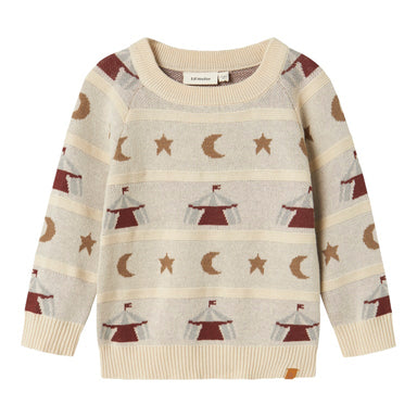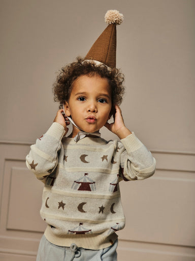 En blød og varm striktrøje med fine måne- og stjernemotiver, der giver et legende og eventyrligt udtryk. Trøjen har ribkanter ved hals, bund og ærm...