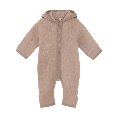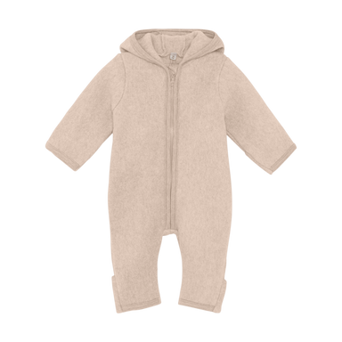 Sød fleecedragt med to små bjørneører på hætten fra HUTTEliHUT. Dragten er lavet i 100% bomuld, som føles ekstra blød. Lukkes med lynlås med hag...