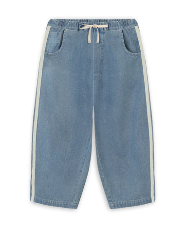 Et par lange denim bukser i 100% bomuld, designet med elastik i taljen for ekstra komfort. Bukserne har praktiske sidelommer, perfekte til at gemme...