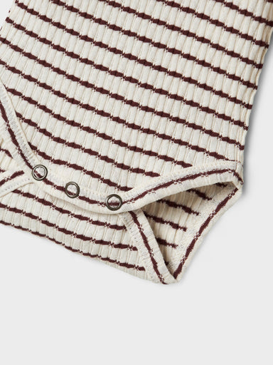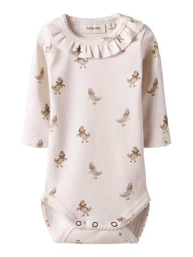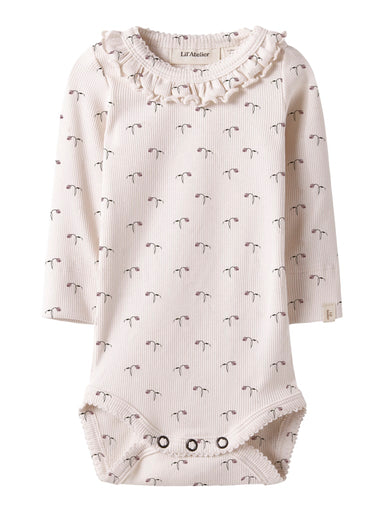 Blød og sød basisbody fra Lil’ Atelier, perfekt til nyfødte. Tansy LS Slim Body er lavet i en ribstrikket blanding af økologisk bomuld, TENCEL™ Mod...