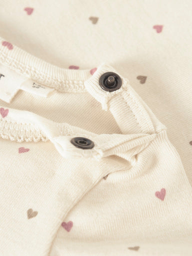 Blød bodystocking i økologisk bomuld med dekorativt hulmønster. Med trykknapper ved benene og venstre skulder, som gør det nemt at klæde barnet på....