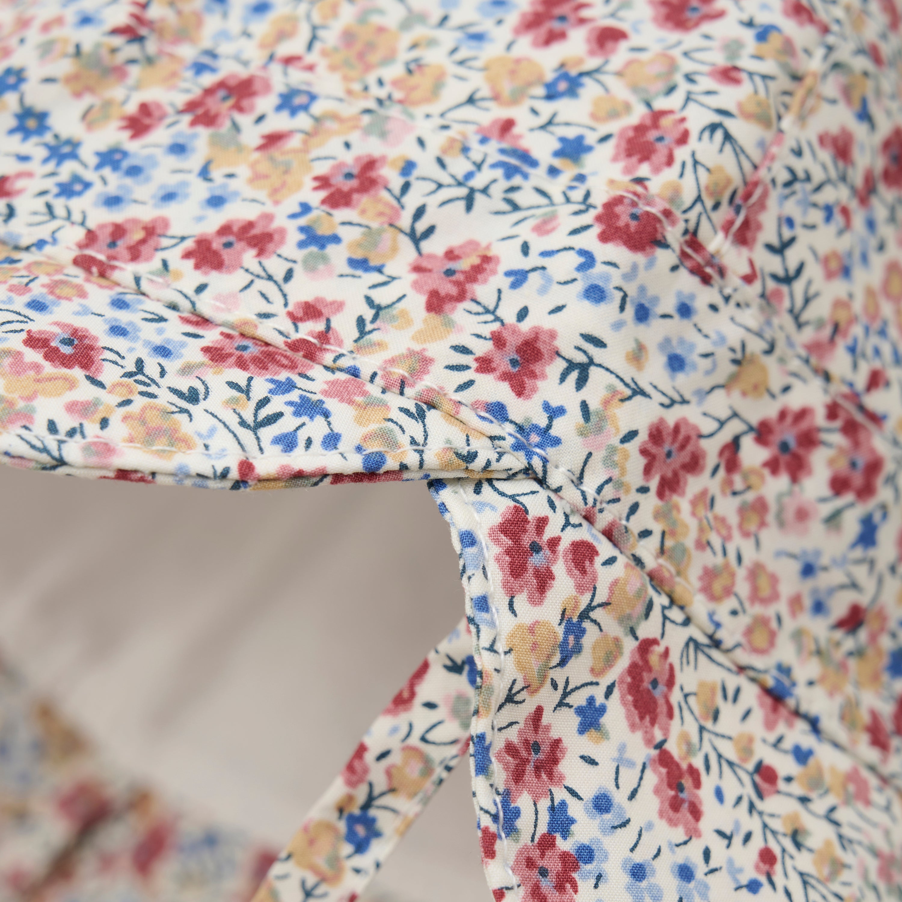 Sød solhat med blomstermønster fra HUTTEliHUT. Hatten er lavet af 100% bomuld. Ensfarvet bomuld lining. Midt på hatten løber en snor, som er elastisk. Bindebånd for at sikre en god pasform. Ekstra længde bagpå og solskygge foran. Perfekt til at give lidt skygge på en varm sommerdag. Certificeret i hht. OEKO-TEX® STANDARD 100 Cert. No. 2276-364 DTI, Made with Liberty Fabric |